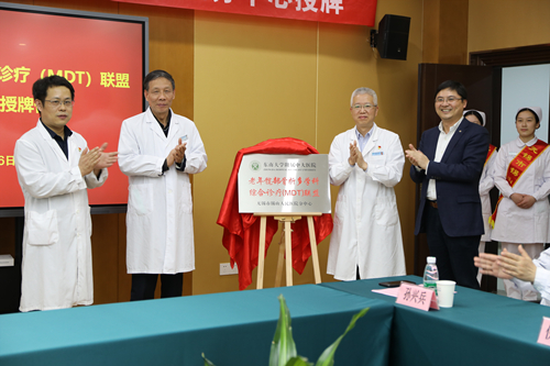 在与会专家的共同见证下,医院党委书记、院长华建平、执行院长范健、芮云峰教授和倪英杰副主任,共同为“东南大学附属中大医院老年髋部骨折多学科综合诊疗(MDT)联盟锡山人民医院分中心”揭牌。