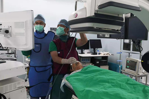 为保证检查的顺利进行,上午7点30,呼吸与危重症医学科医疗团队与手术室、麻醉科医护人员提前完成了检查前的相关准备工作。在介入手术室(DSA室),呼吸与危重症医学科殷明、张卿主治医师在X线的引导下,迅速建立了取样路径,精准取样,仅用时30分钟。