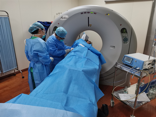 胸外科医疗团队在王新连主任的带领下,为一肺癌患者实施了CT引导下肺癌微波消融术。