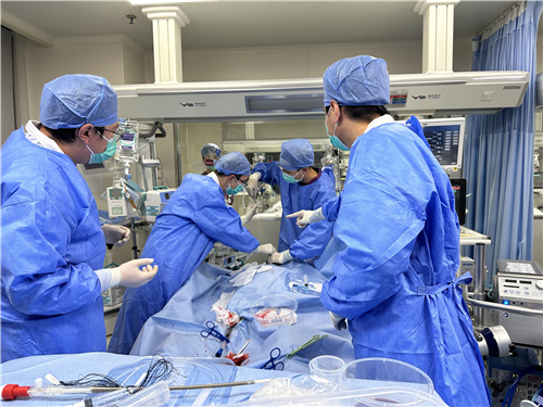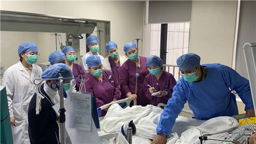 在许玺主任的指挥下,重症医学科ECMO团队迅速行动,调整患者体位,准备机器,预充上机,消毒铺巾。高嵩副主任和车磊主治医师、全友宏主治医师在超声引导下,成功完成穿刺置管,张锡红主管护师、安华主管护师和周华勇护师默契配合,顺利完成ECMO管路和机器的连接。