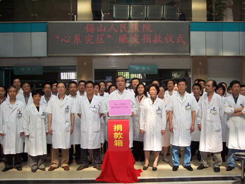 天灾无情,人间有爱。5月19日14时28分,锡山人民医院医护人员在党委书记、院长许长征的带领下,为四川灾区遇难同胞默哀悼念3分钟,同时各科室自发组织为灾区人民伸出援手,许多离退休老职工也赶到了募捐现场,当天共募集善款10万元,献出了医护人员的一片爱心。