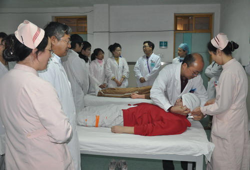 “奚主任,有几名外伤病人病情严重,需要协助抢救,请你快速赶到门诊楼。”接到指令,奚少东主任仅用了3分钟就从病房大楼赶到了演练现场。此时,22位急救队员从医院不同科室也迅速赶到。检查伤势后,各医疗救护小分队立即对濒死伤员进行心肺复苏、头部帽式包扎、下肢长夹板固定,以三人搬运法将伤员抬上担架,迅速转移至抢救室。