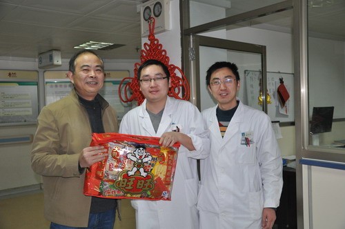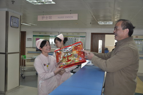 农历大年初一上午8时,在许长征院长的带领下,华建平副院长、朱永坚副院长、张秋莹副院长等全体院领导来院亲切慰问一线职工。院领导带着一袋袋糖果先后来到门诊、急诊、住院部、后勤等各个部门,对职工们在新春佳节放弃与家人团聚仍坚守岗位表示感谢,同时也为大家送上了新春的问候和祝福。院领导勉励职工在新的一年里继续努力工作,为医院建设与发展作出更大的贡献。