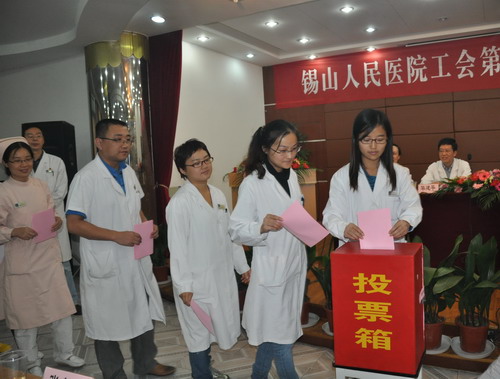 当日,会堂内鲜花绽放,绿景相映,代表们在工作人员的导引下有序入座,个个精神饱满。下午3时,会议在激昂的国歌声中拉开序幕。会议伊始,八届工会主席朱兰代表上届工会委员会向代表们作工作报告。报告回顾总结了我院工会五年来坚持以人为本,为维护职工权益、服务医疗、促进和谐发展所做的各项努力,同时提出了今后五年工会工作的目标和任务。紧接着,与会的代表们按《选举办法》有关规定,采取无记名投票方式进行差额选举,方红、朱兰、孙建飞、李旭东、吴秋南、周冬艳、施启丰、龚正、戴红艳等9位同志当选为新一届工会委员会委员,王新连、惠小锋二位同志当选为新一届经费审查委员会委员。随后,朱兰同志代表新一届工会委员作了表态发言,她指出,新一届工会委员会将继续坚持以邓小平理论和“三个代表”重要思想为指导,全面贯彻即将召开的党的十八大精神,坚持科学发展、和谐发展、创新发展的原则,切实维护职工的合法权益,认真履行工会“维护、建设、教育、参与”四大社会职能,发挥工会的组织优势和阵地优势,围绕医院中心工作,充分调动职工的积极性、创造性,团结动员广大职工在新医院建设发展中建功立业,努力建设有工会特色和文化内涵的“职工之家”。
