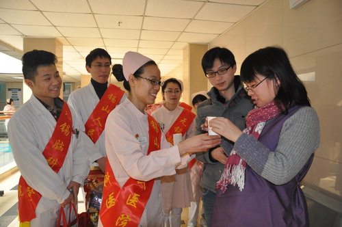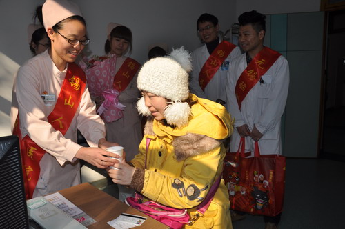 “阿姨,请您喝杯热茶。”大年三十上午十时许,我院爱心志愿服务队队员们在青年党员王芹的带领下,有的手捧鲜花,有的手提热水瓶,有的携带了茶杯、糖果等物品,首站来到了医院门诊。在内科、妇产科候诊室,在检验科窗口,他们指导患者有序就诊,为等待的患者递上了一杯杯暖暖的热水,并送上了真诚的节日祝福。他们的举动温暖了患者,也赢得了患者的好评。