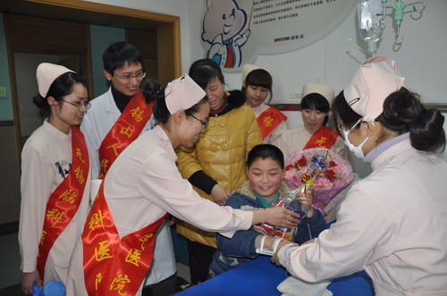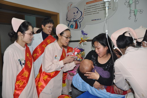 在儿科门诊,一位小朋友因患肺炎已经挂了好几天盐水,小朋友正哭闹着不肯让护士阿姨扎针,志愿者们看到后立即走上前,为小朋友送上了糖果、吉祥挂件等小礼品。小朋友看到身背红色袖带的叔叔阿姨们热情地和他谈笑,也霎时破涕为笑,愉快地伸出了小手,很快就顺利地挂上了补液。