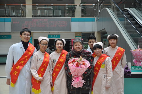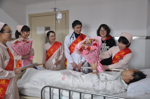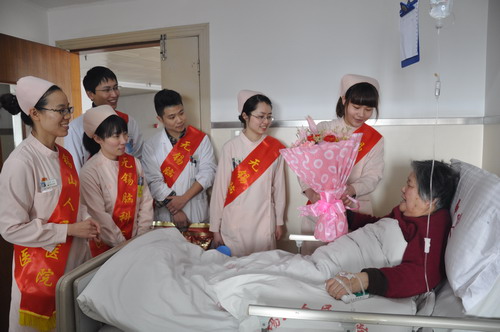 志愿者们一行还来到了住院大楼,在内科病区,他们看望了因病情不能回家团聚的几位患者,为患者送去了鲜花和食品,并关切地询问是否需要帮助。“张阿婆,祝您早日康复,早日和家人团聚!”四川籍的患者张阿婆今年已经71岁了,患糖尿病多年,年前由于感冒、发热入院,子女都在外地,工作繁忙。为了让阿婆不孤单,愉快地过一个新春佳节,志愿者们来到张阿婆的床前嘘寒问暖,并向阿婆的子女发送了慰问短信,张阿婆的心里暖融融的。当张阿婆得知志愿者中的王芹护士,不仅是一名年轻的学生党员,前不久还获得了无锡市“优秀新市民”的荣誉,在这次开展的志愿者服务活动中,还拿出了一部分奖金购买了慰问礼品看望她,她乐呵呵地竖起了大拇指,直夸王芹姑娘了不起。
