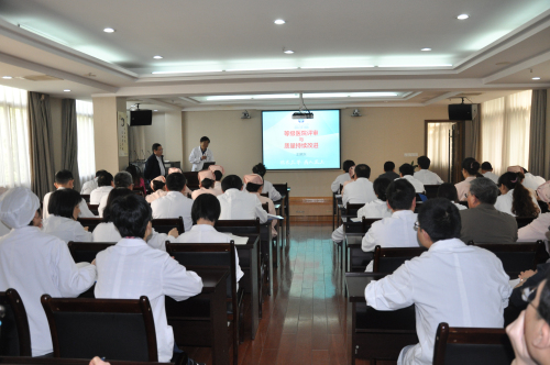 首先由江苏省人民医院医务处处长王晓东作《等级医院评审与质量持续改进》的专题辅导。王处长对照2012版二级综合医院评审标准,从书面评价、医疗信息统计评价、现场评价、社会评价及条款检查要点、个案追踪(案例)等方面的内容作了重点介绍。