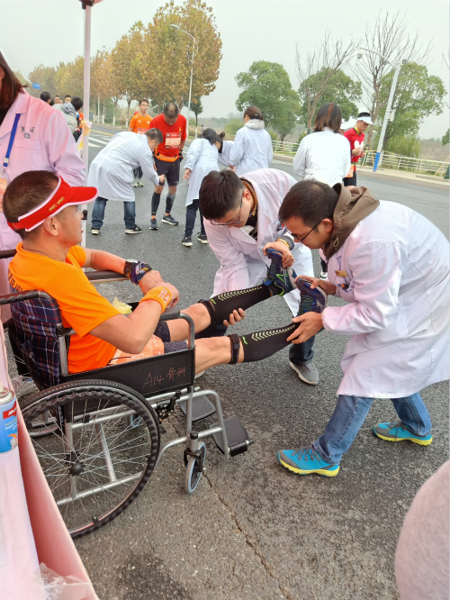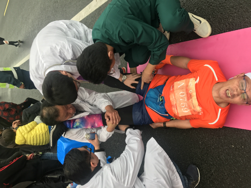 比赛当天,当5公里迷你马拉松获得第四名的15岁小男孩跑完后突感头晕不适,我们的医务人员立即递上一杯糖水并为他检查;其中一名获奖的外籍女选手跑完全程后出现呕吐、腹痛,医务人员让其保暖、卧床休息,同时监测生命体征,为她送上了一杯热饮,并为她热敷、腹部按摩等方式帮忙缓解症状。有的参赛人员跑完感觉胸闷、呼吸不畅的,医务人员让他吸氧、监测生命体征;有的跑完后腿疼抽筋,医务人员帮忙拉伸减痛。