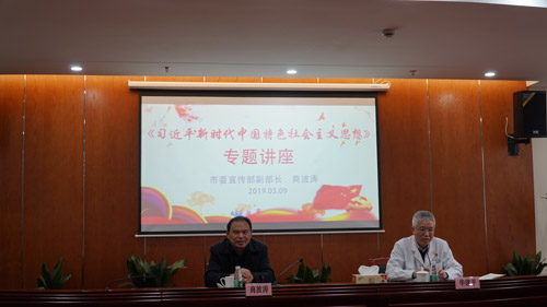 3月9日下午1:30,医院党委邀请了中共无锡市宣传部副部长商波涛来院授课,商部长围绕“习近平新时代中国特色社会主义思想”这一主题作专题讲座。医院全体党员、建党积子约150人参加讲座。党委书记、院长华建平主持。