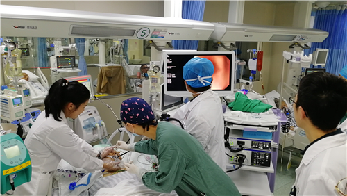 在胃镜辅助置管时,患者血压氧饱和度曾一度下降。ICU医护人员全力救治,患者生命体征恢复平稳,协助杨晓军主任医师顺利完成小肠营养管植入术,为后期进一步治疗提供了有力支持。