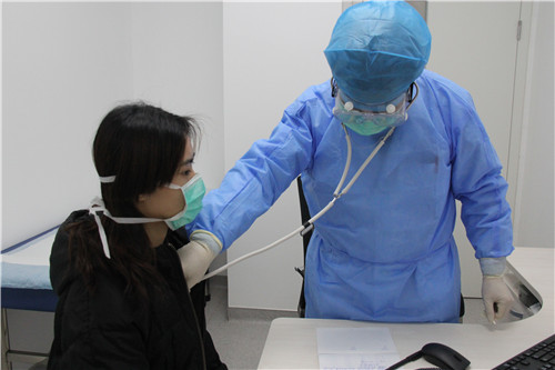 下午1点30分,随着演练总指挥的一声令下,演练正式拉开帷幕,各演练工作组迅速就位。一名18岁女性患者因“发热、咳嗽2天”由母亲陪同来门诊大厅就诊。预检分诊处护士询问病情,测耳温为38.5℃,同时被告知患者为1周前从武汉放假回来的大学生,预检护士立刻予以手消毒和佩戴一次性外科口罩,并引导至发热门诊就诊。