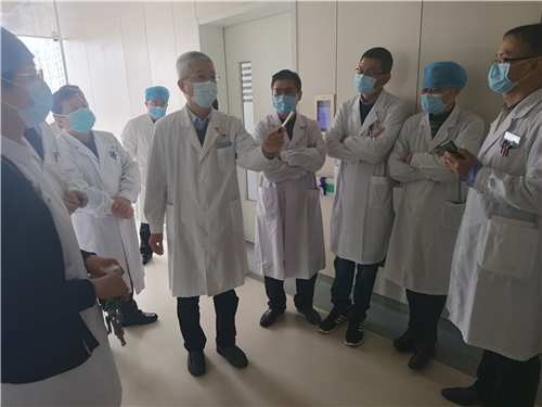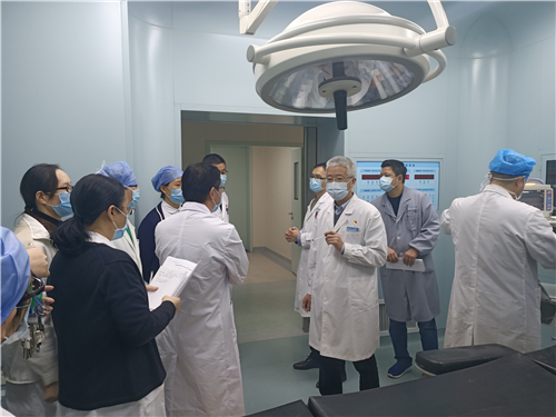 在急诊手术室,华院长指出,人员物资配备、防护措施、消毒杀菌工作必须尽快落实到位,他重点查看了急诊手术室的出入口与区域设置,强调运送患者的通道要加强管理,明确路线规划,始终保持畅通。孙伟副院长表示,为确保安全有效地处置疫情期间的突发情况,明日起将组织应急演练,进一步开展安全排查工作。
