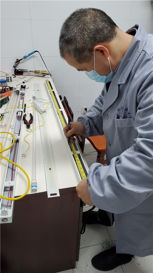 一听说驰援武汉的医护人员还缺少紫外线消毒灯,但因特殊时期,市场无法供应购置,设备科科长助理陈添便考虑自己动手为医护人员制作简易紫外线消毒灯。有了这个想法以后他立即付诸行动,即刻尝试制作。他利用现有的日光灯灯架进行改造,但制作时发现缺少灯座的材料,于是他又寻求后勤保障人员粟光炳师傅解决困难,30分钟内制作完毕,第一次测试便成功了。于是他们又“趁热打铁”,一共完成了15套紫外线灯灯架,当即交付应急办发往前线。
