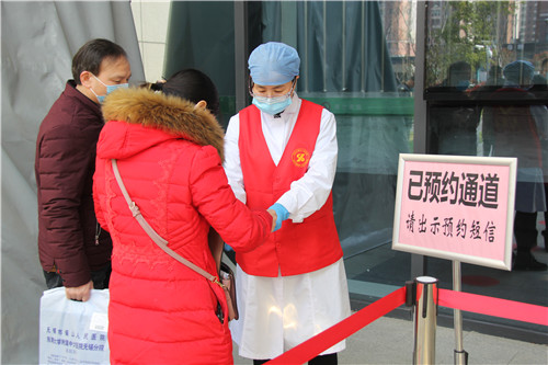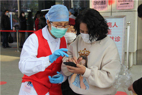 “您好,请问您预约了吗?没有,我来帮您!”3月16日7:30,在我院门诊大厅外已有市民排起了长队。现场,十几名身穿红马甲的志愿者正逐一指导预约,耐心解答市民疑问。