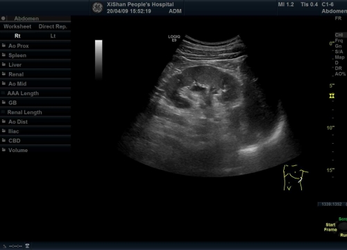几年前,黄大爷因左肾部位酸痛曾在多家医院就诊,检查发现他左肾有一大小5.6cm左右的囊肿,外科医生建议手术切除。黄大爷害怕手术,拒绝了外科手术的建议,当他听说我院超声医学科开展硬化治疗,疗效明显,慕名而来。去年11月,黄大爷因左腰部酸痛不适前来我院就诊,彩色超声检查发现他左肾近肾门处囊肿大小为7.1*5.4cm,已压迫左肾集合系统,引起少量肾脏积水。在仔细询问病史后,超声科阚晓纯主任决定开展超声引导下肾囊肿穿刺硬化治疗术。