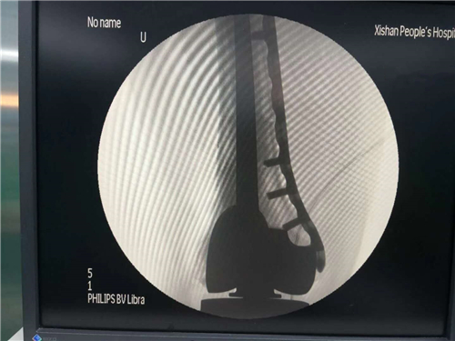 经过充分的术前准备,4月11日,在孙伟副主任的指导下,顾军主任团队为患者实施了右股骨远端肿瘤切除、瘤段灭活和旋转铰链膝关节重建术。手术历时3小时,成功将患者骨肿瘤完全切除,膝关节假体置换到位,手术大获成功,最大限度地保留患者的肢体功能。术后,患者恢复良好,经过膝关节功能锻炼后,已可以拄拐下床行走,显著的疗效令患者和家属称赞连连。