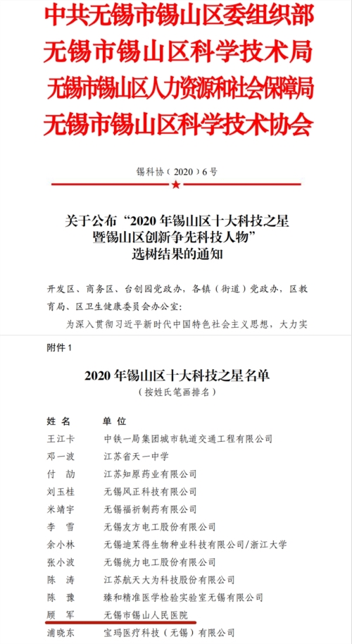 今年5月30日是“全国科技工作者日”,无锡市科协召开了“全国科技工作者日”系列活动启动仪式暨“2020年百名科技之星、十大创新争先科技人物”发布会。会议表彰了“2020年无锡市百名科技之星”,我院骨科顾军均名列其中。同时,锡山区委组织部、区科技局、区人社局和区科协联合发文,授予顾军“2020年锡山区十大科技之星”荣誉称号。