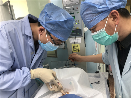 6月12日下午,胸部CT检查报告显示,患儿右侧气胸,压缩30%,新生儿科立即邀请胸外科紧急会诊。经会诊,胸外科副主任徐伟峰明确患儿为右侧气胸,同时合并肺透明膜病,需立即开展胸腔闭式引流术。随后,徐伟峰副主任精准定位,细心操作,紧急实施手术,抽出30ml气体,此时患儿胸廓饱满明显好转,吸气三凹征得到明显改善,但患儿仍时有呻吟,新生儿科及时调整CPAP(无创呼吸机)参数,密切观察患儿生命体征。
