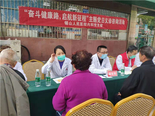 今年是中国共产党成立100周年。为进一步深化党史学习教育,切实将“学党史、悟思想、办实事、开新局”的目标要求落到实处,内科党支部积极组织党员开展志愿服务活动。近日,在党支部书记杨晓军的带领下,9名党员来到羊尖社区,开展了“奋斗健康路,启航新征程”主题党日义诊咨询活动。