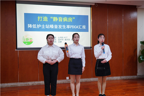 竞赛现场还邀请了护理部PDCA 优秀案例代表A17病区的《降低护士站噪音发生率》和品管圈优秀案例代表A21病区的《降低住院患者口服恒康正清药物恶心呕吐发生率》上台进行了展示,汇报人员熟练脱稿、PPT图文并茂以及多人合作汇报形式让在场的观众眼前一亮。