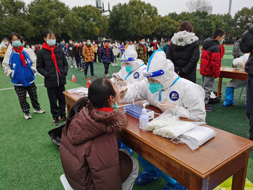 大部分采样点都是露天的,远远望去只见一条条长龙,“龙头”就是医务人员的采样点位置所在,一个个“大白”的身影清晰可见。采样点有医护人员,也有警察和志愿者,大家都穿着防护服,为了便于区分,有的人则在防护服背面写上医生、护士、警察、志愿者等字样,加以识别。大家冒着寒风,各司其职,忙而不乱,井然有序。