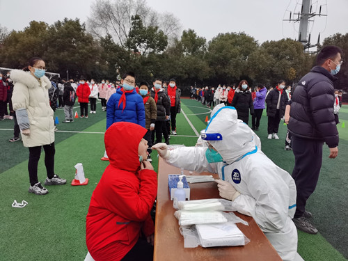 “来,小朋友勇敢一点,张大嘴巴说啊……”“谢谢叔叔阿姨,轻一点哦!”当前面的小朋友采好核酸发现并不痛的时候,他们同学之间相互做起了思想工作:晓红,不痛不痛,你不要害怕,一点也不痛的,加油哦!零下3°的学校操场,寒风呼啸,孩子们冻得手脸通红,但是他们非常配合,不急不躁,一个个安静整齐地排着队伍。