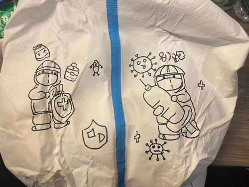 “今天我以战胜疫情、上海加油为主题,帮大家在防护服上画了漫画,除了为伙伴们加油,更重要的是要帮助病人树立战胜疫情的信心……” 翁洁怡表示,画画不仅能改善工作氛围,还能让自己在疲惫的一天感到一丝快乐,大家喜欢,自己也觉得很开心。