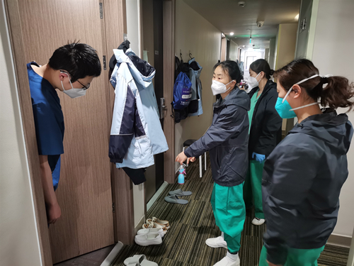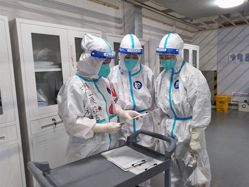 抵达上海后,作为一名有经验的感控护士,队员们的安全是重中之重。待队员们收拾完毕后,我召集队员们培训,进行自我防护以及穿脱防护服的考核。