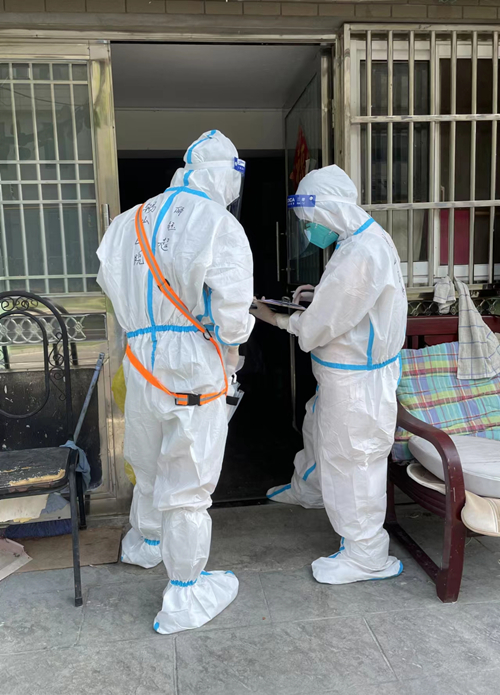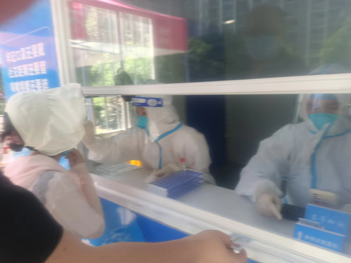 7月7日上午,米婧婧正在检测基地工作,突然接到紧急通知,她和同事李恩凤被抽调至参加区内闭环式核酸采样工作。当天中午,19名同事被分派至安镇封控小区——鑫安苑三期,上门采样。