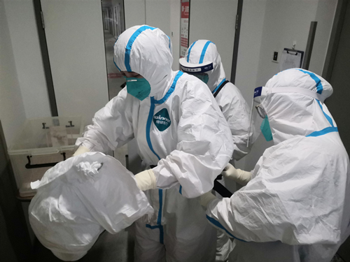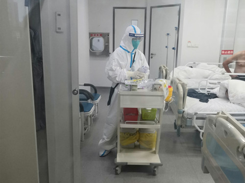 “刚开始进入隔离病区时,我有些紧张,但三级防护和动力送风系统的使用,再加上病区督导员认真指导穿脱防护用品,让我更有勇气开展好各项工作。” 车磊这样描述他在隔离病区的工作感受。6小时一班,24小时轮班,提前两小时上岗,这样的工作强度开始大家有些不适应,但坚持几天后就习惯了。“每天我们都要为患者采核酸,开展查房、书写病历等工作,三级防护下几分钟内汗水就渗了出来,但在这里身着防护服要持续工作两小时以上,我都能坚持。有时也为身体不适的同事多分担一些,大家在这都很团结,相信很快我们就会结束战斗。”车磊对完成任务信心满满。
