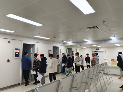 在我院健康管理中心,应征青年在征兵工作人员的引导下,分组分批有序交叉体检,先后完成了彩超、血检、尿检、视力、听力、心电图、心理测试及内外科等10多个项目检查,秩序井然。