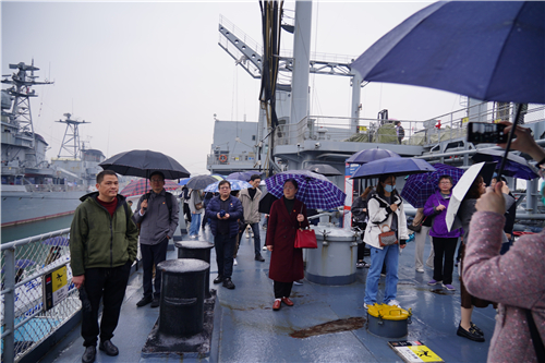 下午,党员们冒雨参观了泰州海军舰艇文化园,感受“海军诞生地,水兵母亲河”的深厚文化底蕴。泰州海军舰艇文化园是一处集科普教育、军事教育、党史学习教育为一体的海军文化展示平台和海军主题教育基地,园内有“三舰一艇”,分别为881洪泽湖补给舰、108西宁号导弹驱逐舰、515厦门号导弹护卫舰和274潜艇。在解说员的带领下,党员干部们了解了不同舰艇的功能、不同的船舱结构,学习了相关军事装备知识,体验了在潜艇内狭小的空间内穿行的过程,了解海军官兵在舰艇上的工作、生活情况,深刻感受到了海军建设的艰难历程,也感受到了人民海军的日益强大。
