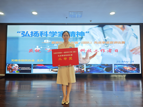 5月25日上午,由无锡市医院协会主办,医学科普管理专委会协办的“弘扬科学家精神——最美科技工作者(团队)先进事迹宣讲比赛”在市疾控中心五楼会议室举行,来自全市各医疗单位的16名选手围绕主题,进行了精彩纷呈的演讲。经过激烈角逐,我院内分泌科秦艳医生凭借出色的现场表现,以优异的成绩荣获比赛二等奖。