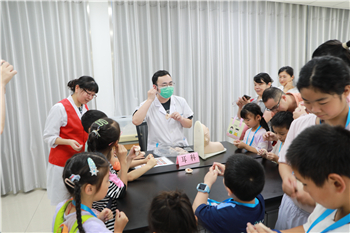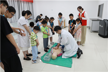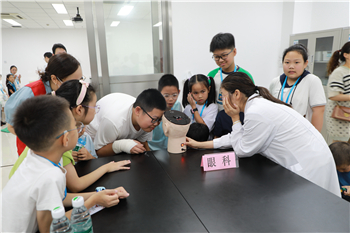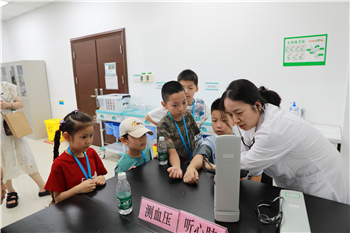 随后,孩子们来到临床技能培训中心,各专科医师分组向孩子们认真讲解了脉搏和血压的测量方式、听诊器的使用方法;眼睛和耳朵基本结构以及爱耳护眼的健康知识;心肺复苏的操作步骤。孩子们聚精会神地观看示范动作,开展分组练习,积极探索医学知识。