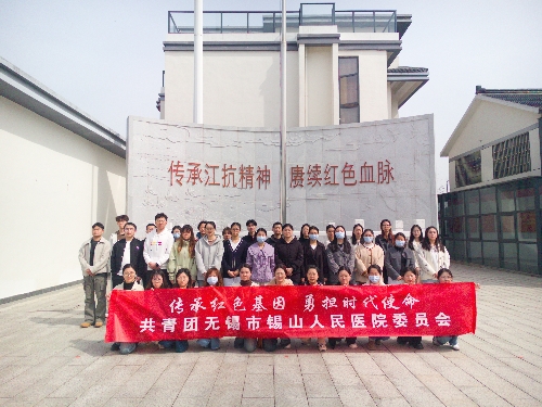 在锡东革命烈士陵园,全体团员青年整齐列队,面向革命烈士纪念碑默哀。2名青年代表史凯文、许晁榕向烈士纪念碑敬献花圈,寄托青年医务人员对烈士的无限哀思与缅怀。