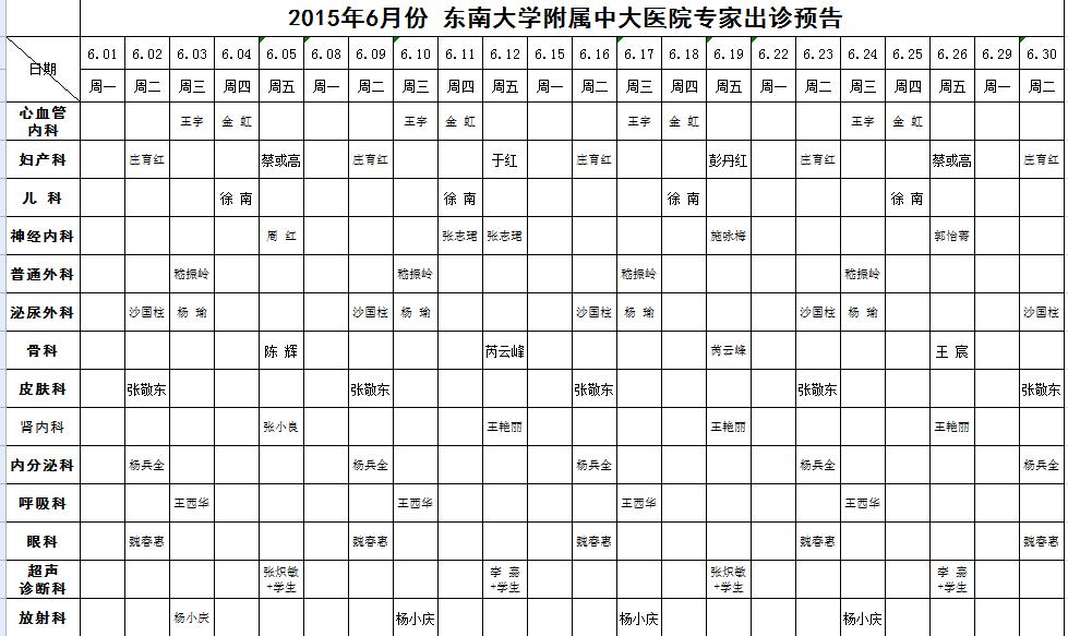 6月份东南大学附属中大医院出诊专家表