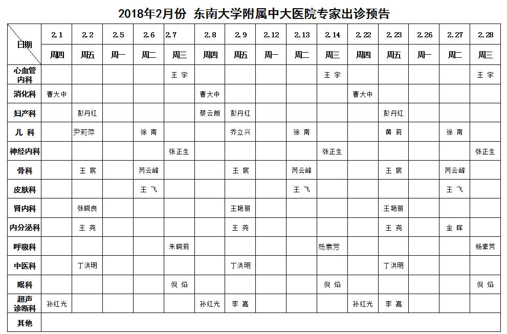 2018年2月份东南大学附属中大医院专家出诊预告