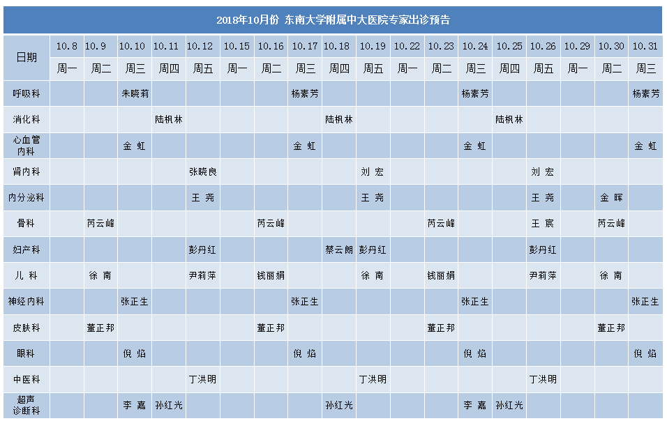2018年10月份东南大学附属中大医院专家出诊预告