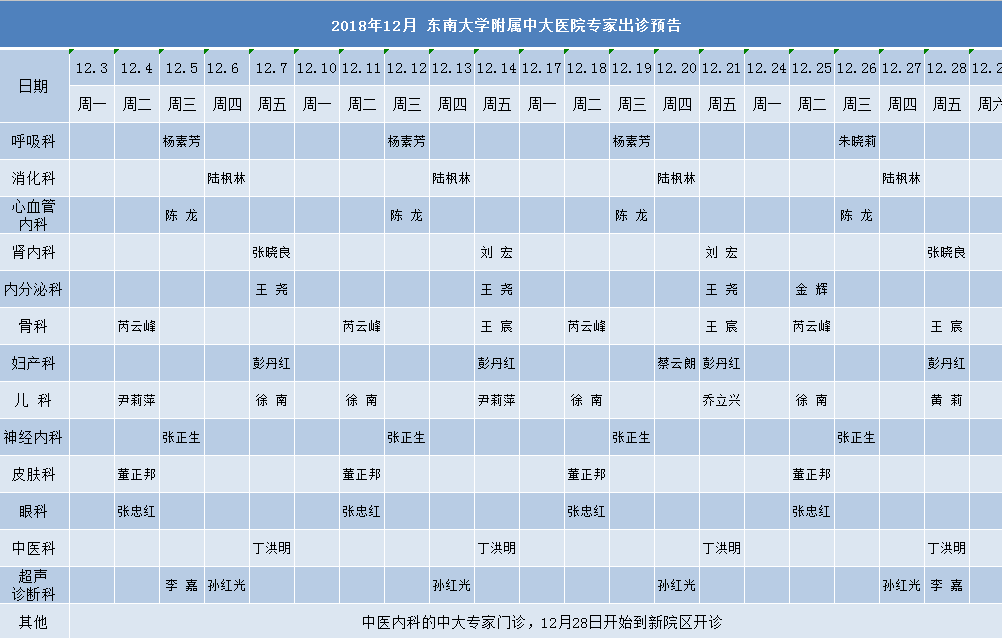 2018年12月份东南大学附属中大医院专家出诊预告