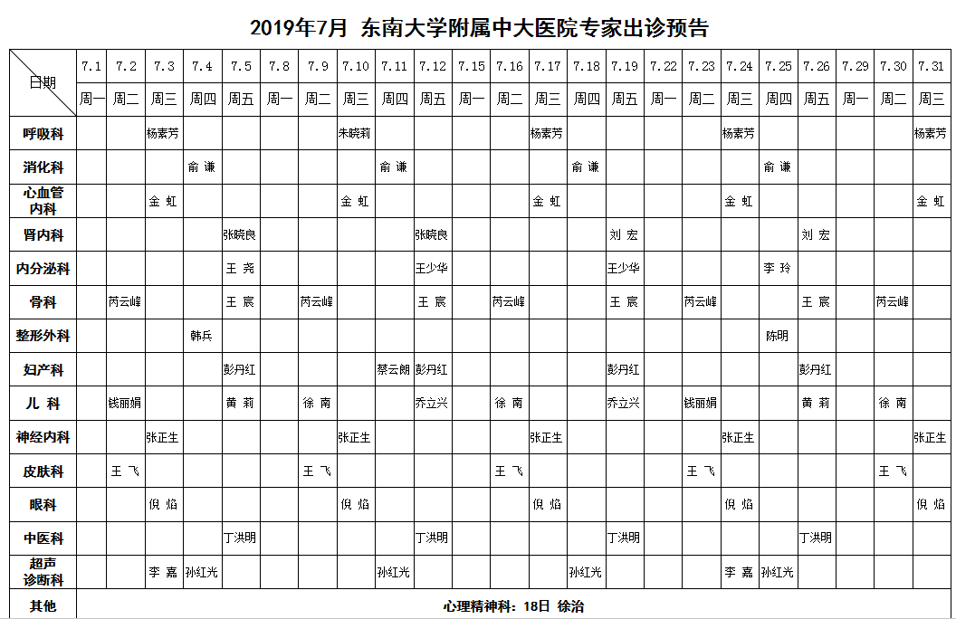 2019年7月份东南大学附属中大医院专家出诊预告