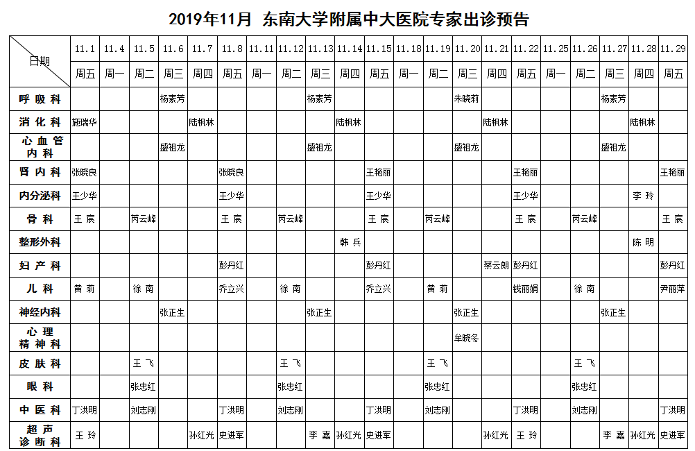 2019年11月份东南大学附属中大医院专家出诊预告