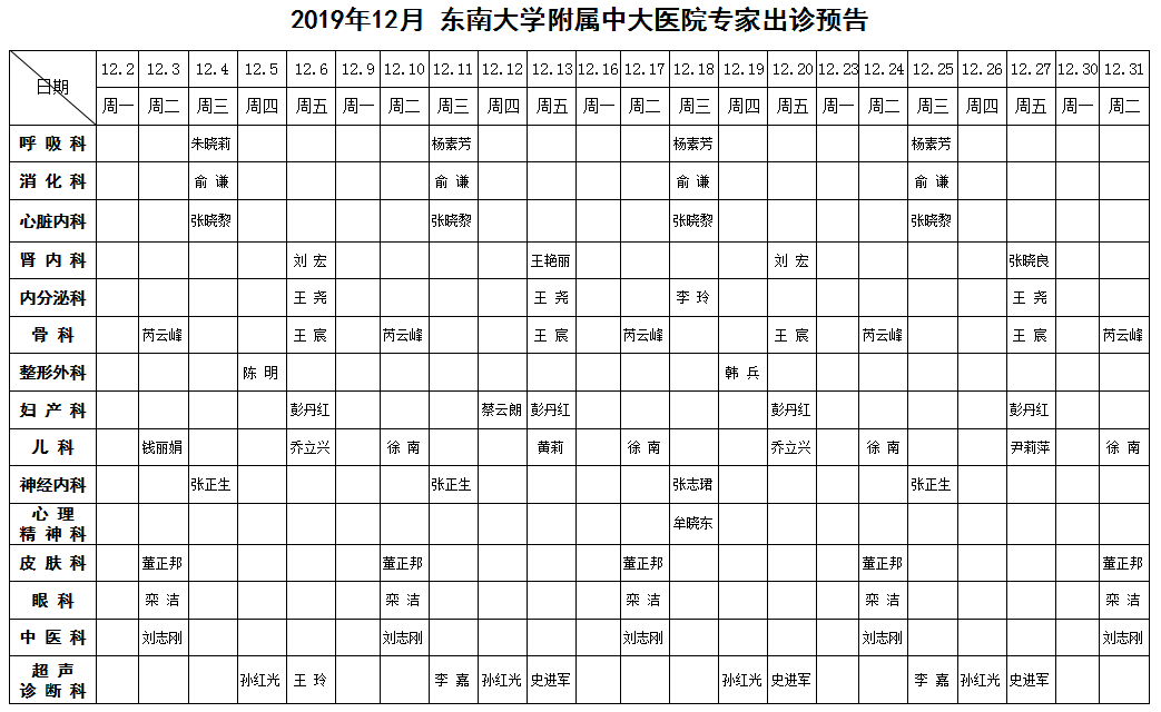 2019年12月份东南大学附属中大医院专家出诊预告