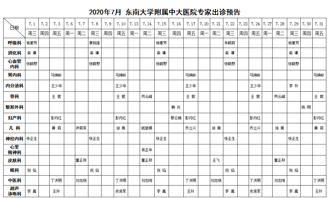2020年7月份东南大学附属中大医院专家出诊预告