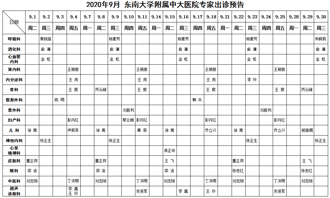 2020年9月份东南大学附属中大医院专家出诊预告