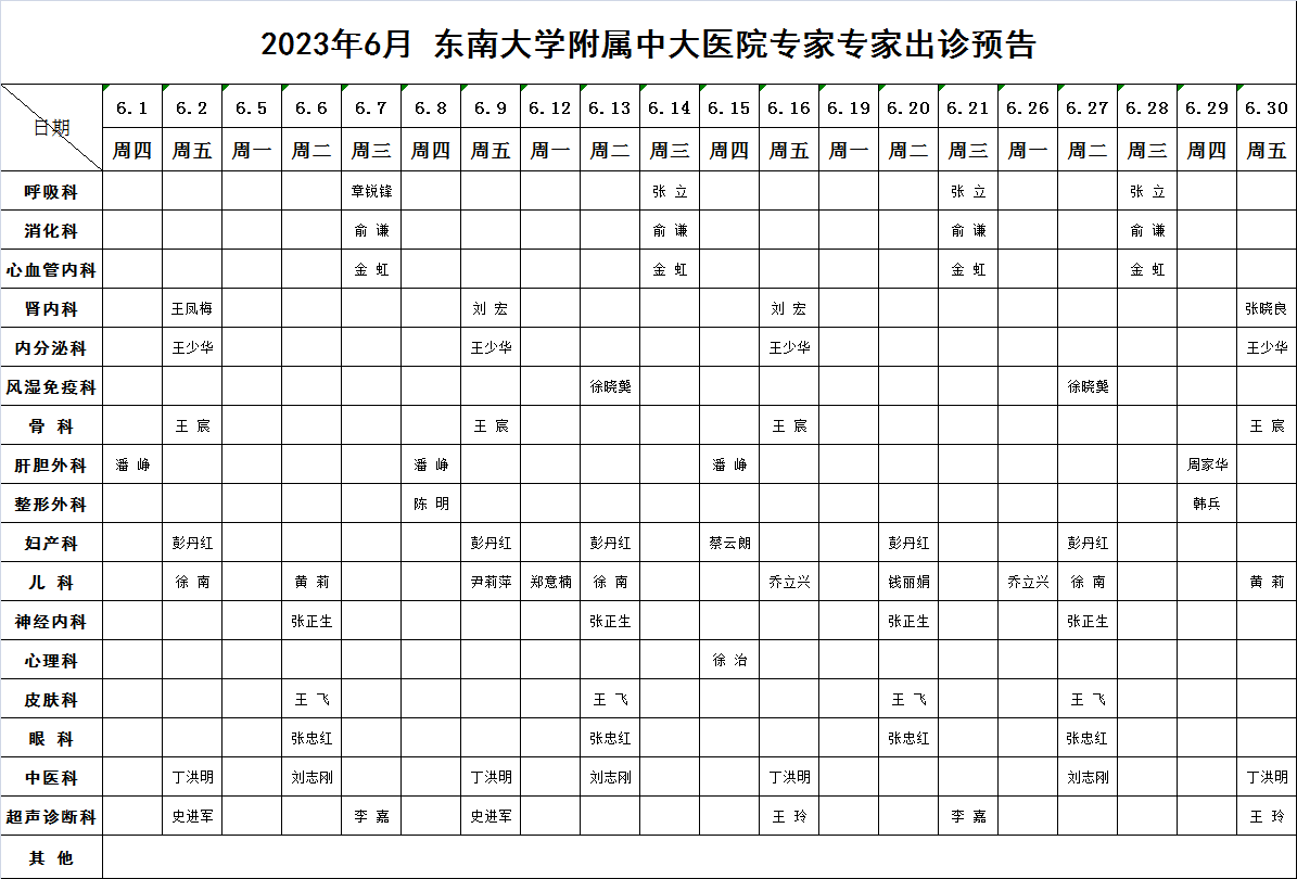 2023年6月东南大学附属中大医院专家出诊预告