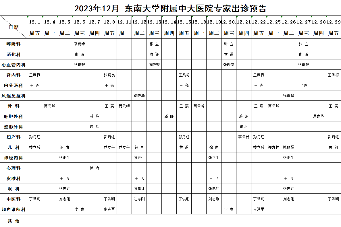 2023年12月东南大学附属中大医院专家出诊预告