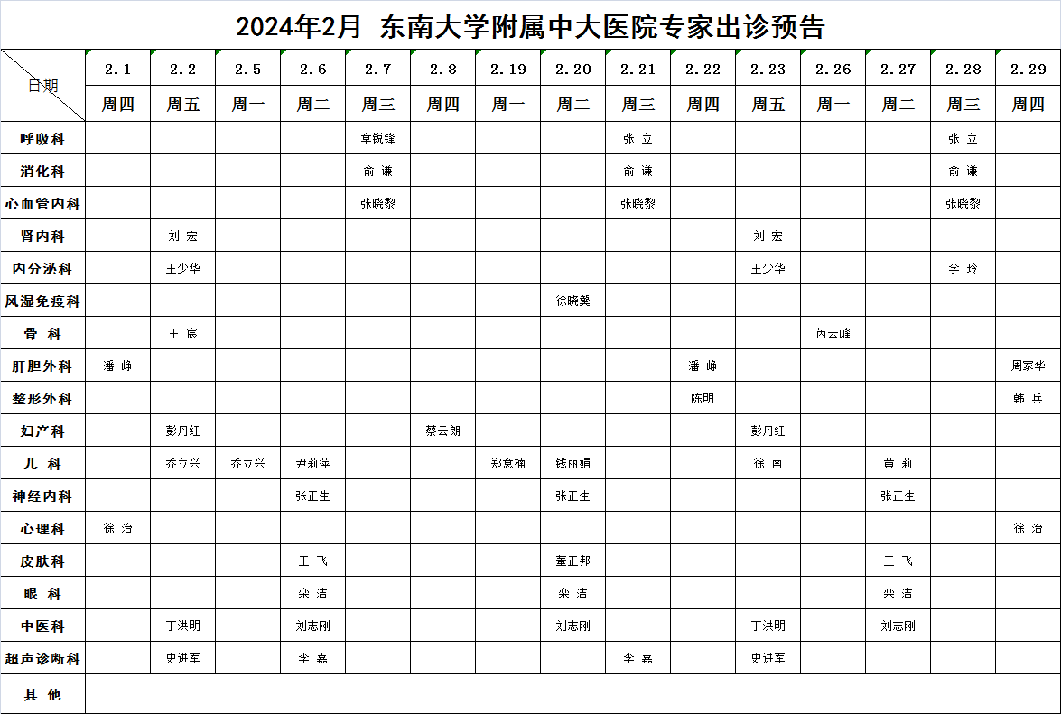 2024年2月东南大学附属中大医院专家出诊预告