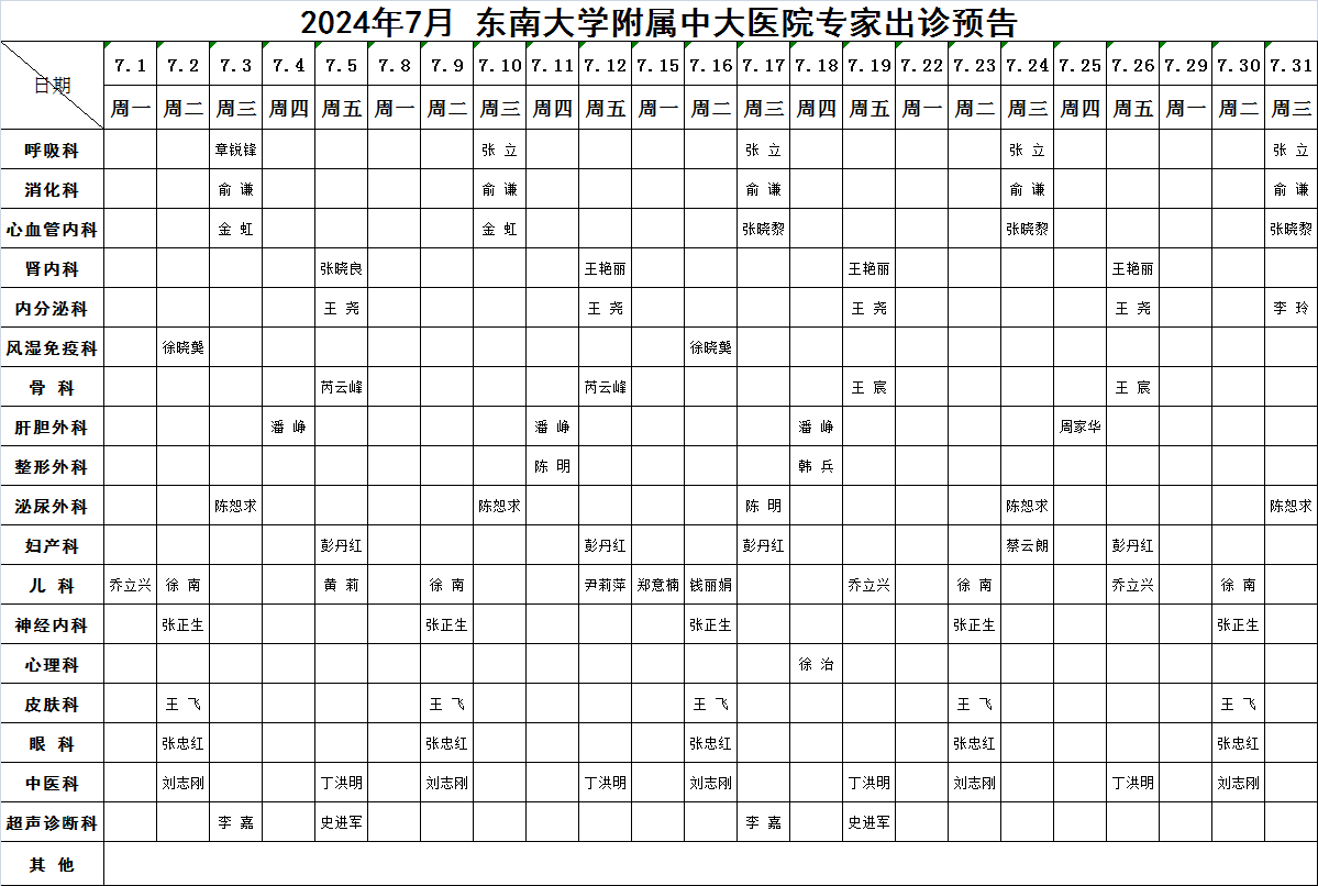 2024年7月东南大学附属中大医院专家出诊预告