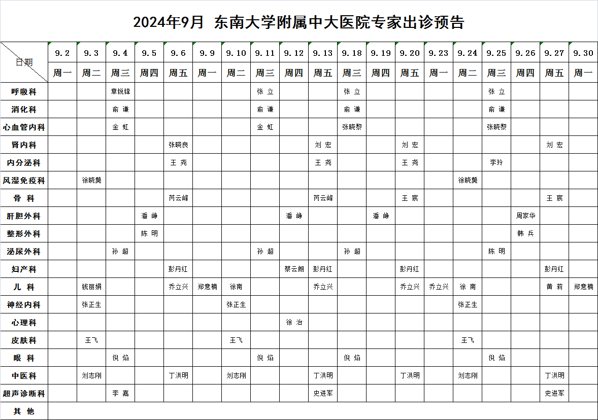 2024年9月东南大学附属中大医院专家出诊预告